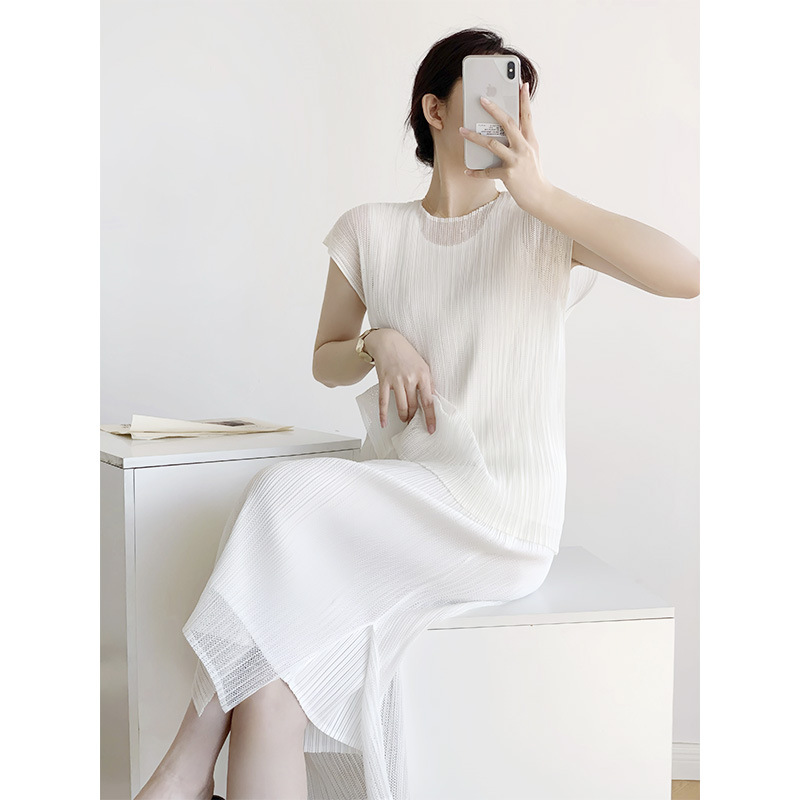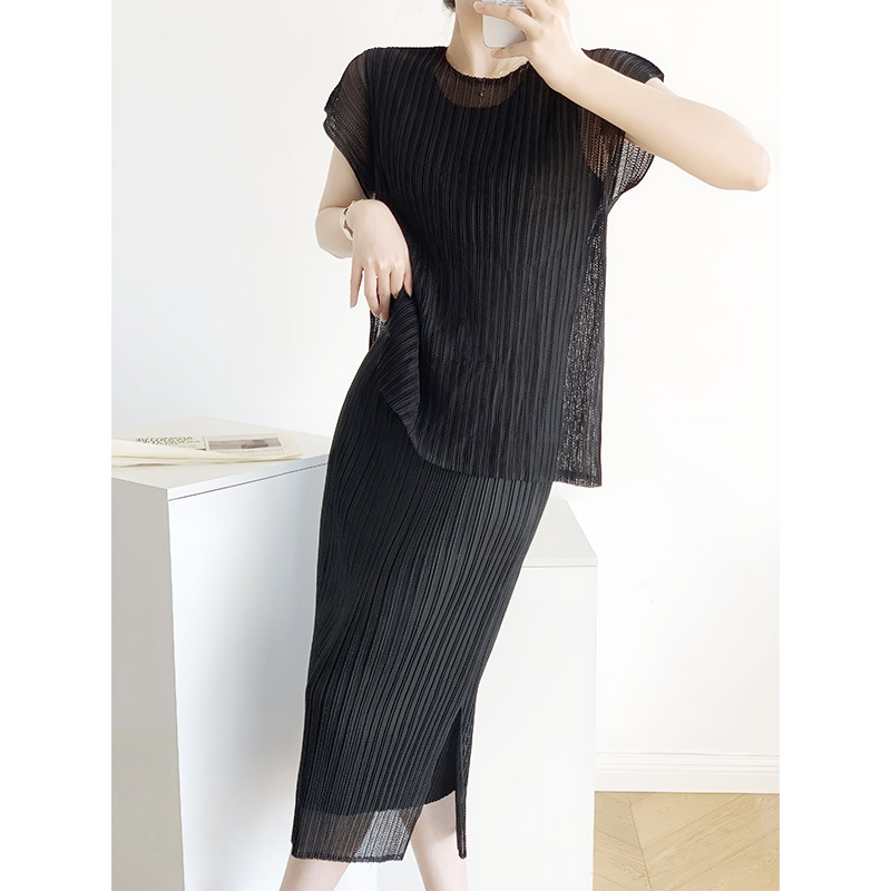Three-House Folded Temperament Net Folding Set Thin Temperament Blouse Short-Sleeved Skirt Large Size Women's Clothing HZ1225